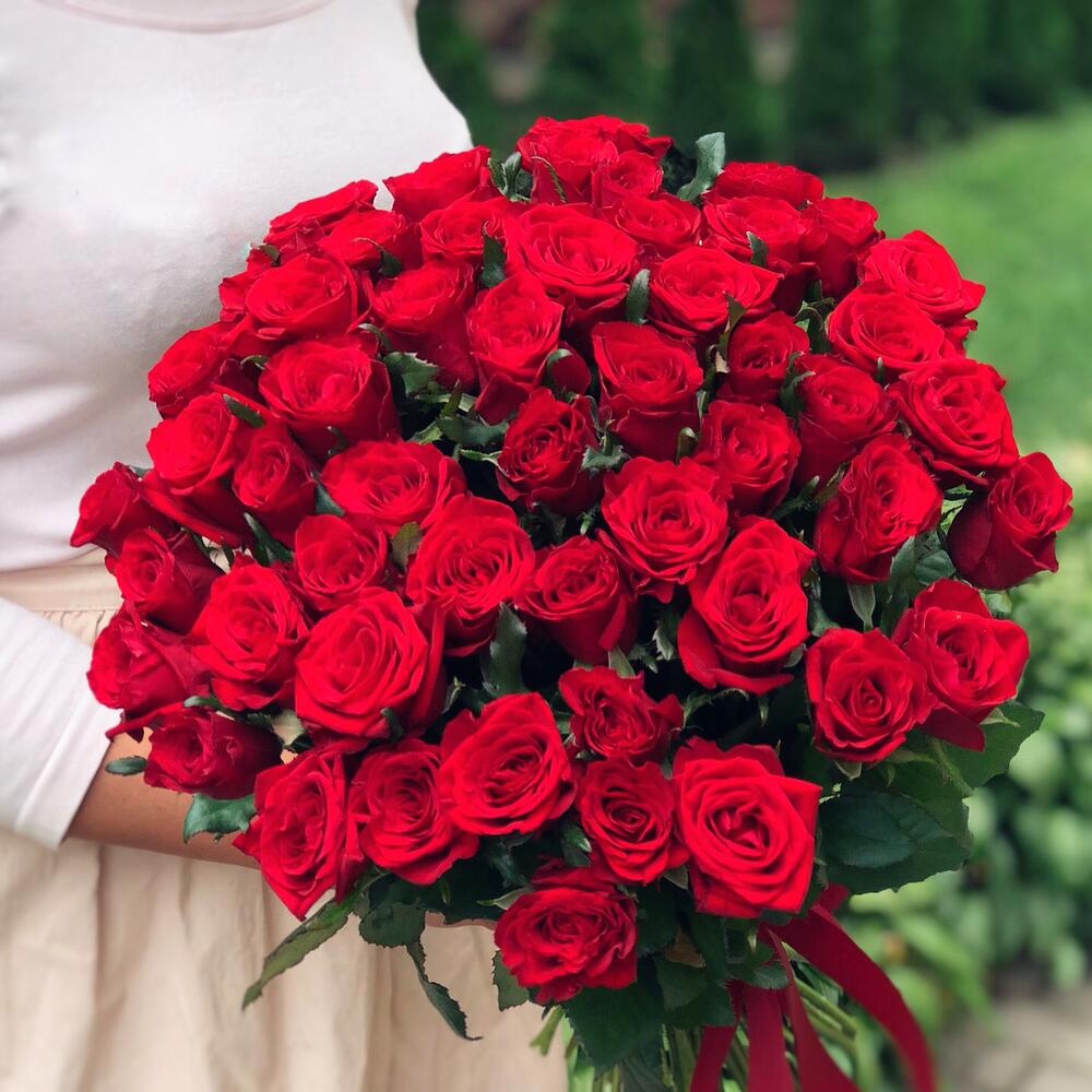 Composition : rose rouge - 51, ruban - 2. Dimensions : largeur - 40 cm, hauteur - 50 cm, longueur - 50 cm (emballage compris). Dimensions : 40 x 50 x 50 cm