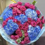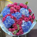 Bouquet d'hortensias bleus et de roses pivoines branchues