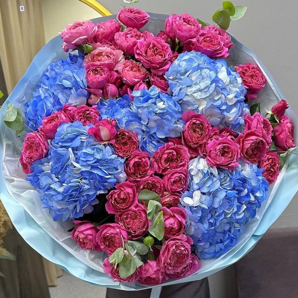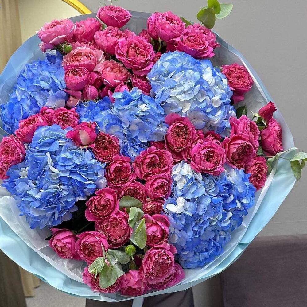 Bouquet d'hortensias bleus et de roses pivoines branchues