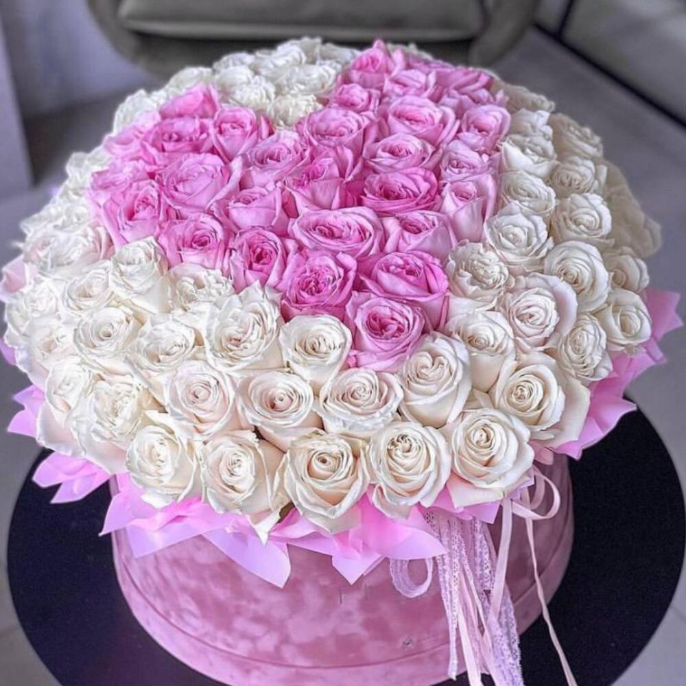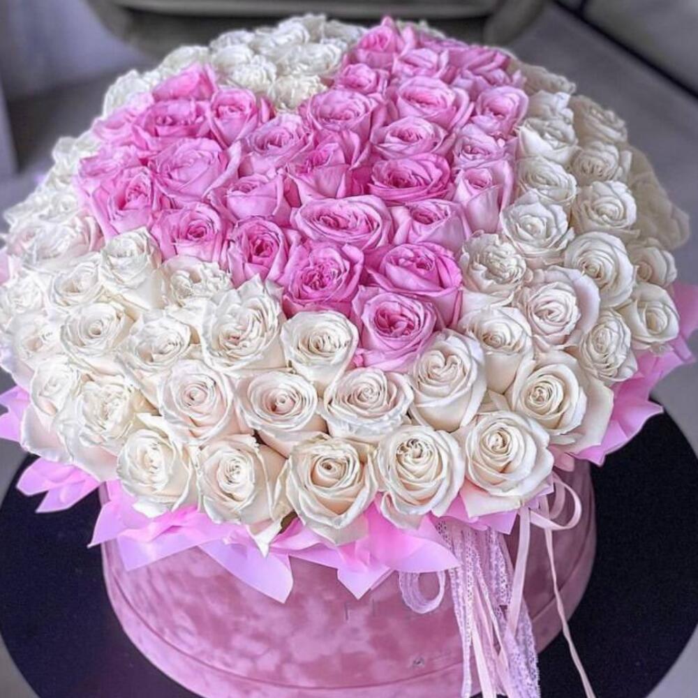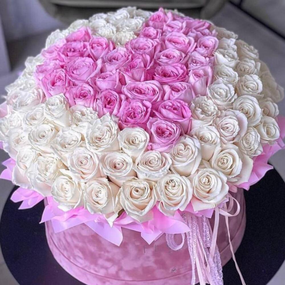 Bouquet de roses roses et blanches dans une boîte à chapeau "Heart"