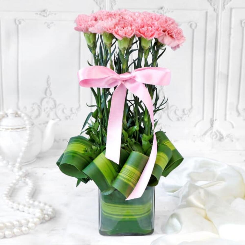 Détails du produit : 10 œillets roses. 2 à 3 tiges de feuilles de parvifolia vertes. 6 à 8 tiges de feuilles de Dracaena Fragrans Massangeana. Fermé avec un ruban gros-grain rose clair. Magnifiquement fabriqué à la main dans un vase carré en verre de 10 x 10 cm.