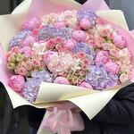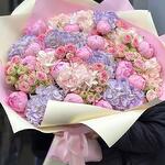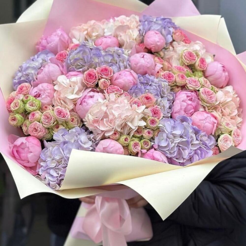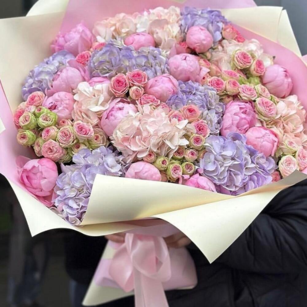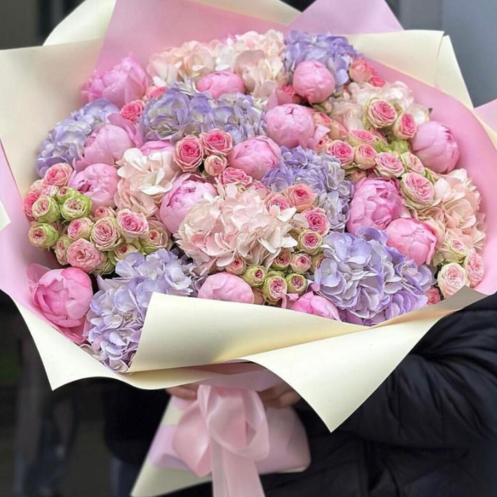 Bouquet de pivoines roses, roses buissonnantes en forme de pivoine, hortensias assortis