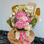 Ribbon - 1 pce Hydrangea - 3 pce Pistacia - 2 pce Lisianthus - 4 pce wrapping paper - 1 pce pittosporum - 2 pce rose david austin - 7 pce