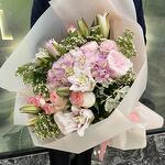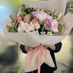 Composition : Alstroemeria - 1, Lys doubles orientaux - 4, Caméliques - 2, Hortensia - 1, Rose Jumilia - 10, Pistache - 1, Rose David Austin - 3, Œillets mélangés - 2, Papier d'emballage floral - 1. Dimensions : Largeur - 55 cm ; Hauteur - 65 cm ; Longueur - 65 cm (emballage compris). Dimensions : 55 x 65 x 65 cm