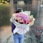 Composition : Mélange d'hortensias - 3, Roses importées roses en spray - 3, Roses Pink Expression - 3, Mattiola - 3. Dimensions : Largeur - 50 cm ; Hauteur - 55 cm ; Longueur - 55 cm (emballage compris). Dimensions : 50 x 55 x 55 cm