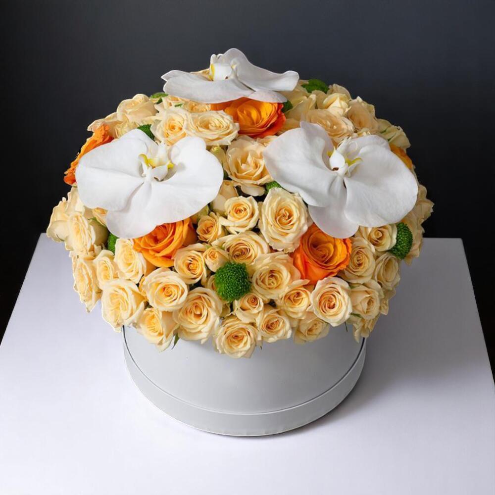 Boîte à fleurs Harmonie pêche et orange avec orchidées et chrysanthèmes – élégant arrangement rond