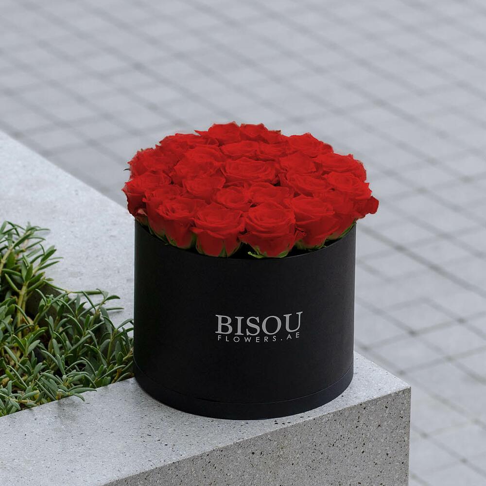Arrangement en boîte de 25 tiges de roses rouges dans une boîte noire