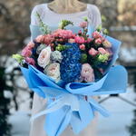 Composition : 1 hortensia, 4 rosiers Madame Bombastic, 2 rosiers White Ohara, 1 lisianthus, 2 hypericums, 2 freesias, 1 delphinium, 1 rosier branchu Julieta peach, 2 œillets Space Dyed, 1 skimmia, 6 emballages, 1 ruban. Dimensions : largeur 45 cm ; hauteur 60 cm ; longueur 60 cm (emballage inclus). Dimensions : 45 x 60 x 60 cm.