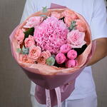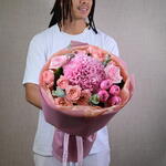 Ribbon - 1 pce wrapping paper - 4 pce pink hydrangea - 1 pce tissue - 2 pce eucalyptus leaves - 1 pce rose o'hara rose - 2 pce pivoine roses silva - 4 pce
