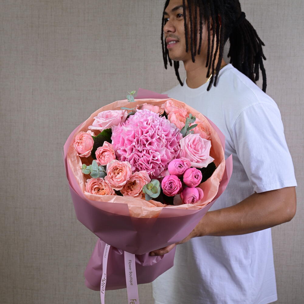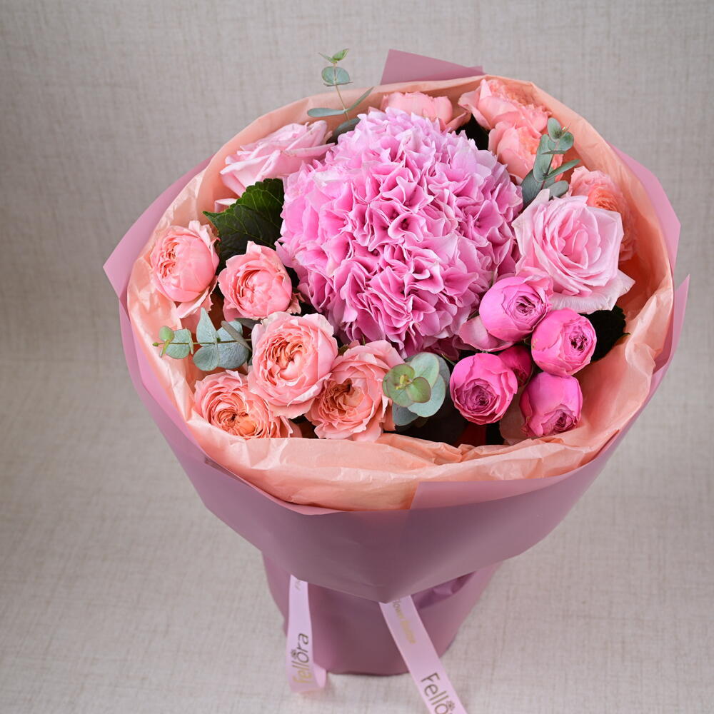 Ribbon - 1 pce wrapping paper - 4 pce pink hydrangea - 1 pce tissue - 2 pce eucalyptus leaves - 1 pce rose o'hara rose - 2 pce pivoine roses silva - 4 pce