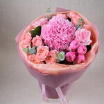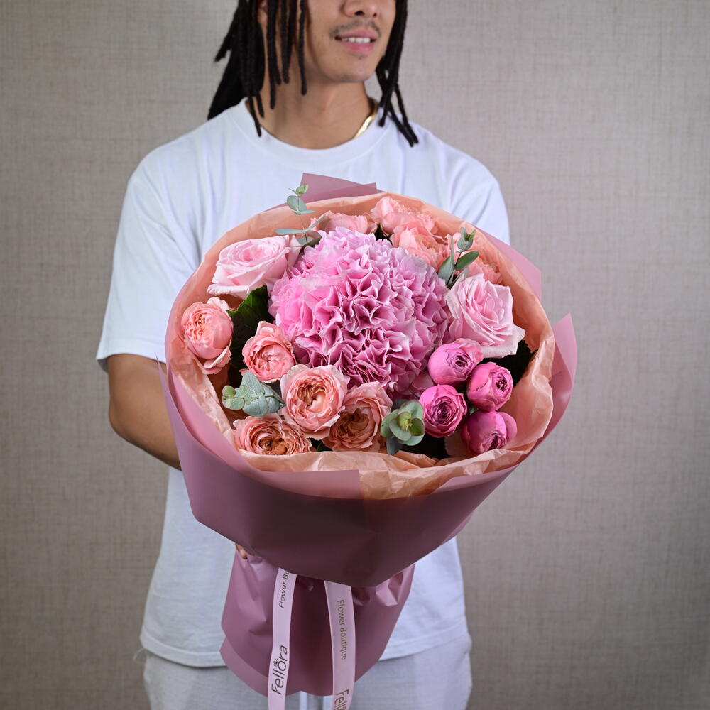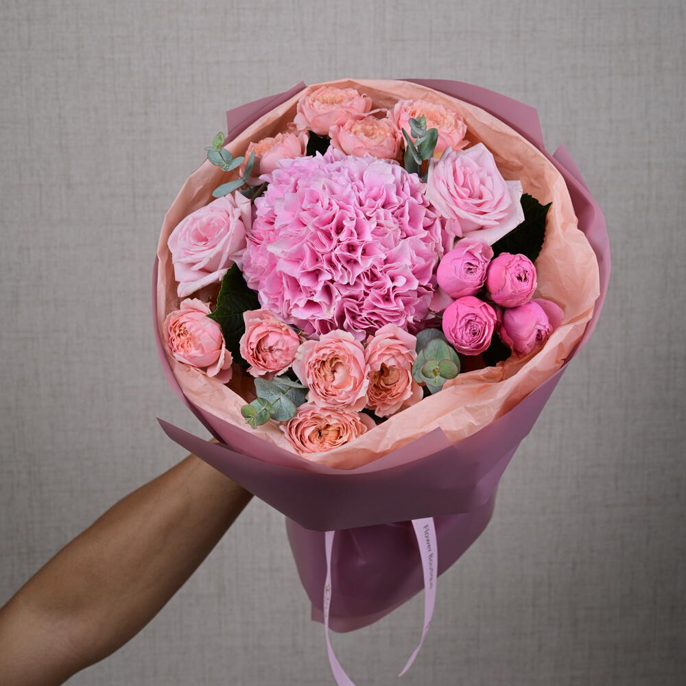 Ribbon - 1 pce Hydrangea - 1 pce wrapping paper - 4 pce tissue - 4 pce eucalyptus leaves - 1 pce ohara rose - 2 pce pivoine roses silva - 4 pce