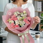 This exquisite Mono Bouquet consists of 9 tender pink carnations perfectly aligning with 4 pristine white Eustomas, elegantly wrapped in 5 pieces of pink cover. Boasting an eye-catching combination of hues, this bouquet emanates pure elegance and charm suitable for any occasion.