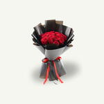 Bouquet noué à la main composé de 15 roses rouges fraîches, élégamment arrangées et délicatement emballées dans un papier noir raffiné, un geste intemporel d'amour et d'admiration.