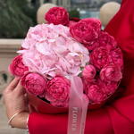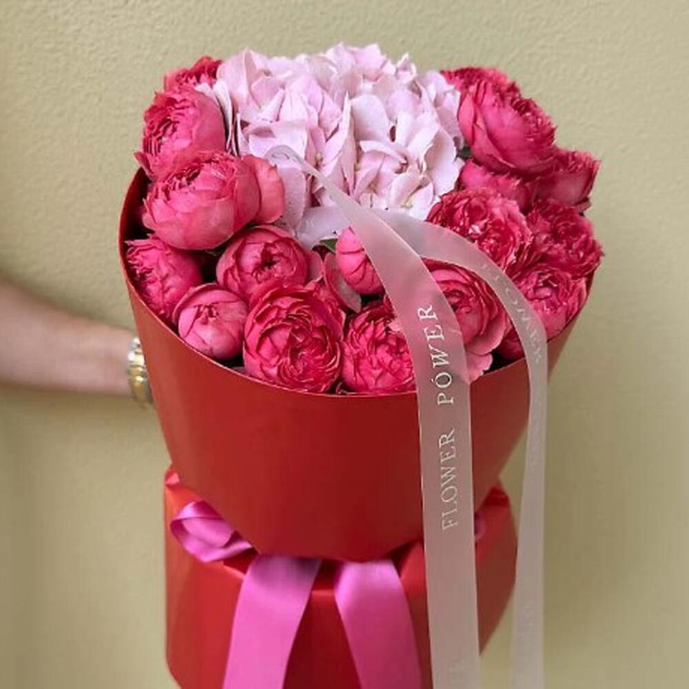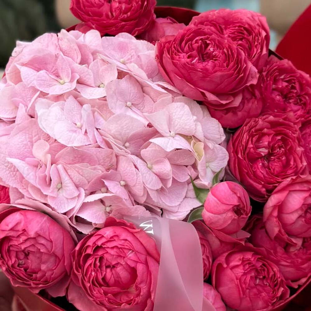 Un bouquet délicat et charmant d'hortensias rose pâle et de roses élégantes, rappelant un doux jardin de printemps. Cet arrangement évoque des sentiments de tendresse, de joie et d'affection douce — un cadeau parfait pour un anniversaire, pour exprimer sa sympathie ou juste comme ça.