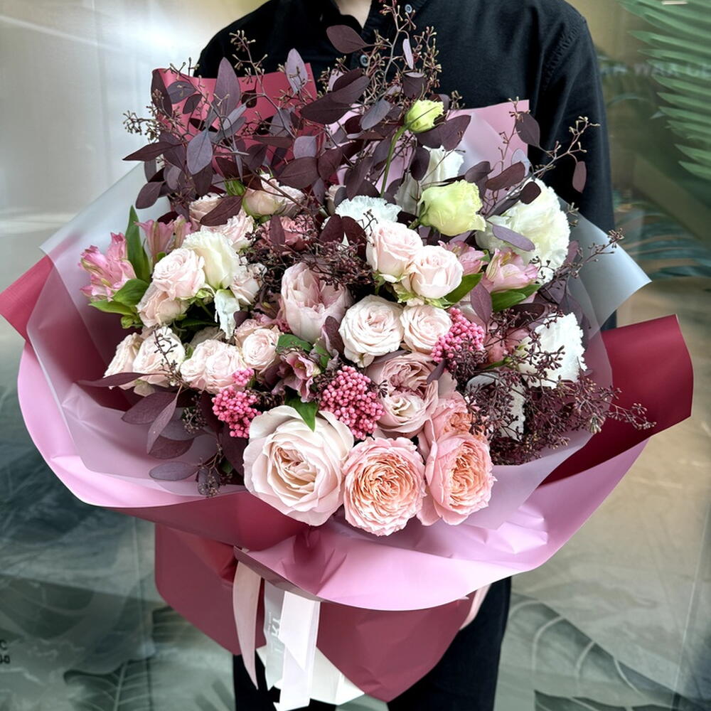 Composition : 2 eucalyptus populus avec baies, 3 rosiers David Austin, 2 rosiers Julieta pêche, 2 ozothamnus, 3 alstroemerias, 4 rosiers Bombastic, 4 lisianthus, 5 emballages, 1 ruban. Dimensions : largeur 50 cm, hauteur 60 cm, longueur 60 cm (emballage inclus). Dimensions : 50 x 60 x 60 cm.