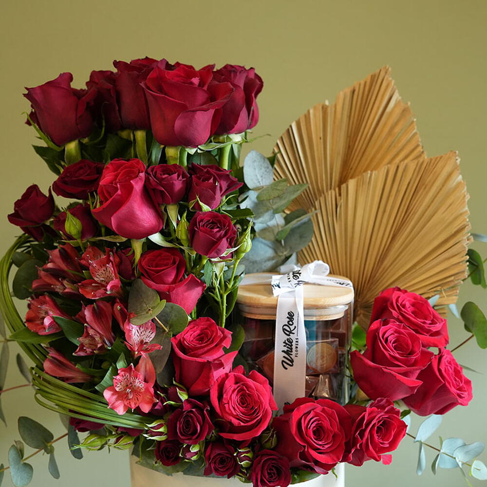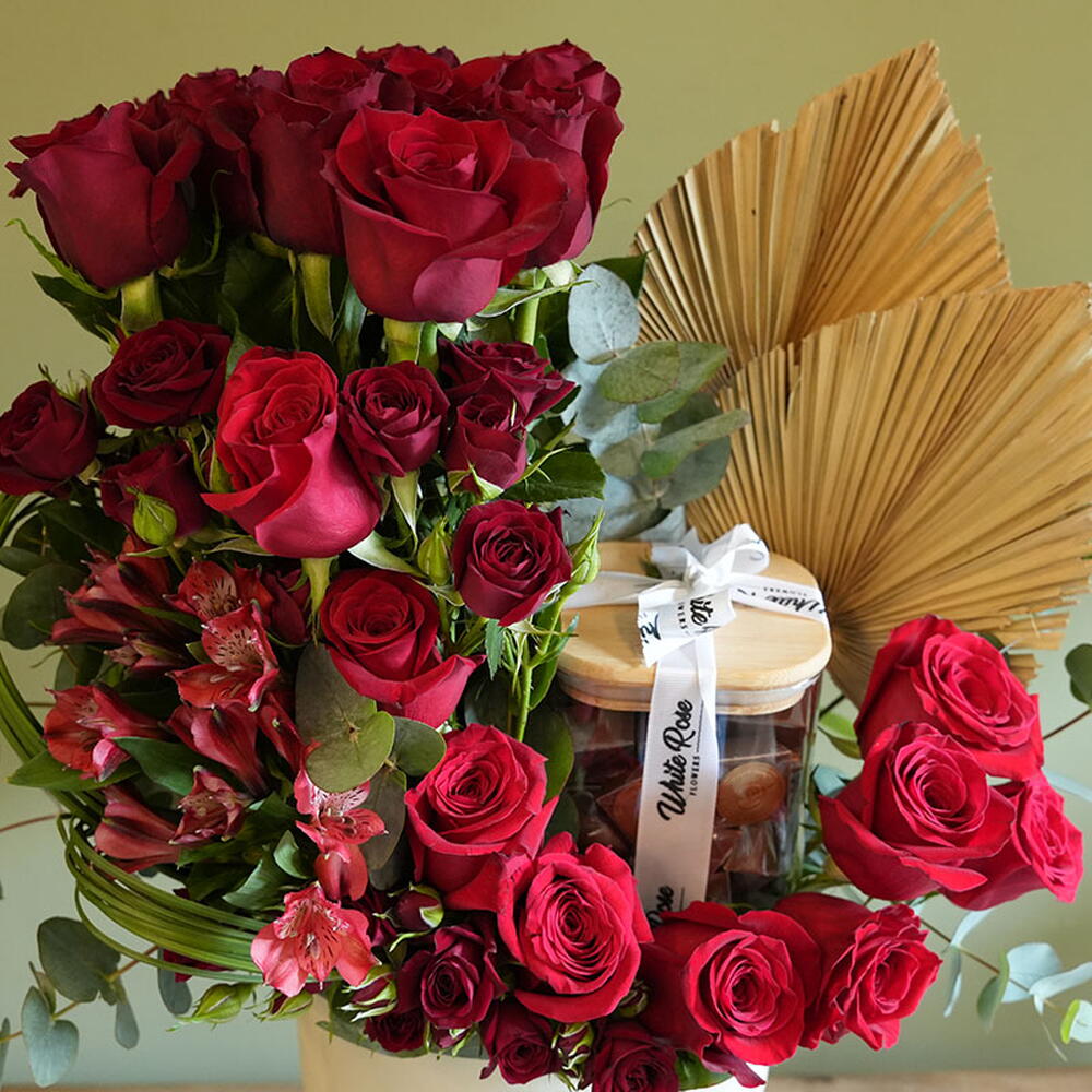Combinaison de roses rouges, de mini-roses et d'autres fleurs, arrangées avec 450 g de chocolat dans un vase en cuir