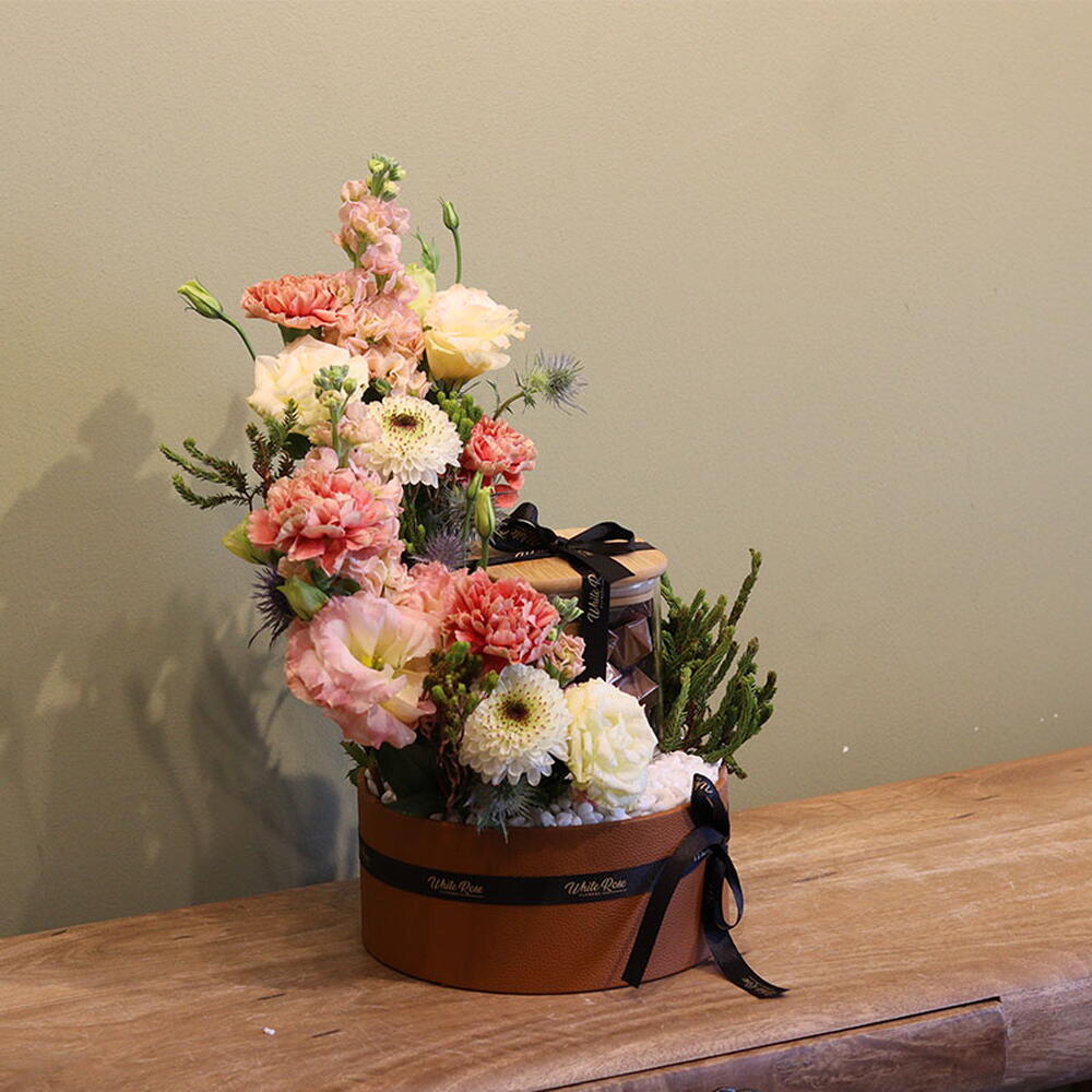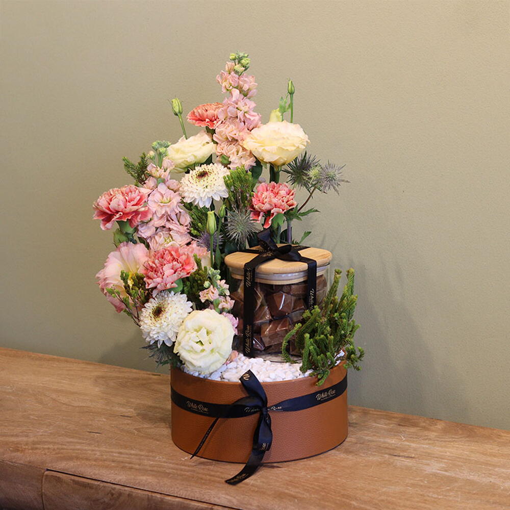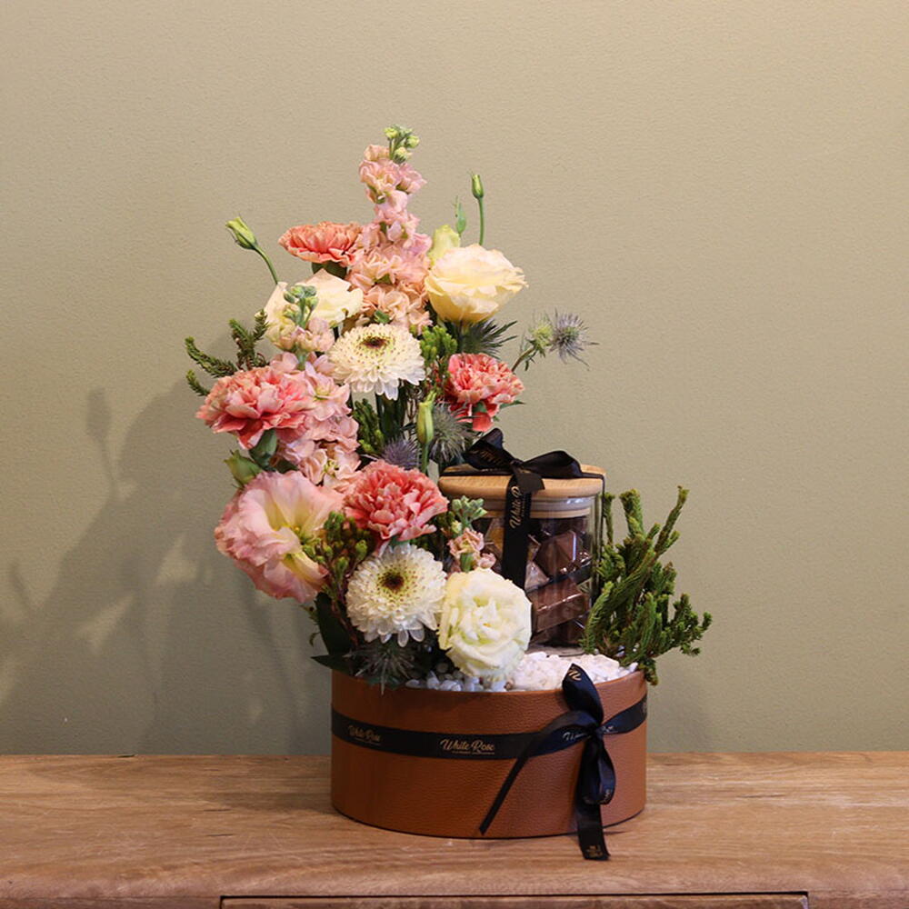 combinaison de lisianthus, d'œillets, de matthiola et d'autres fleurs mélangées, disposées avec 400 g de chocolat dans une boîte en cuir