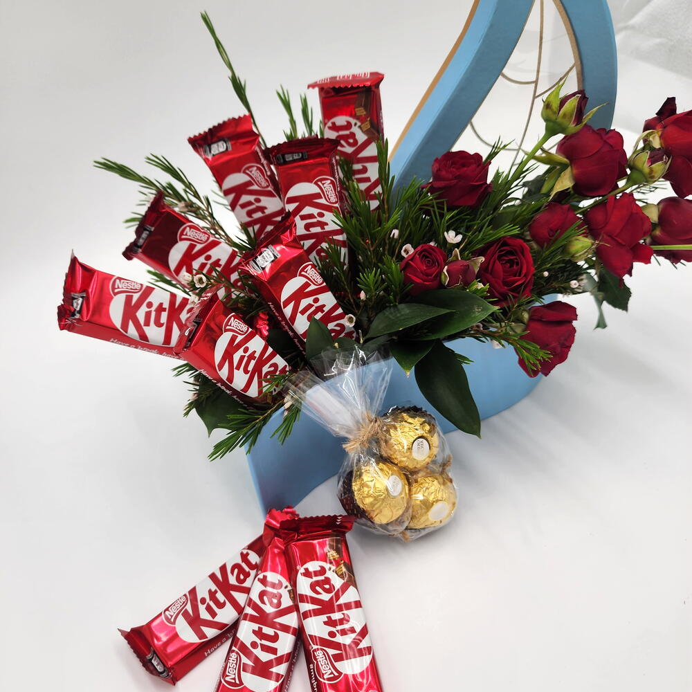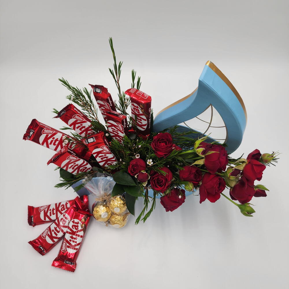 Wax flower - 3 pce kit kat chocolat - 10 pce ruscus leaves - 3 pce mini-roses rouges - 6 pce boîte de feuilles haut de gamme - 1 pce