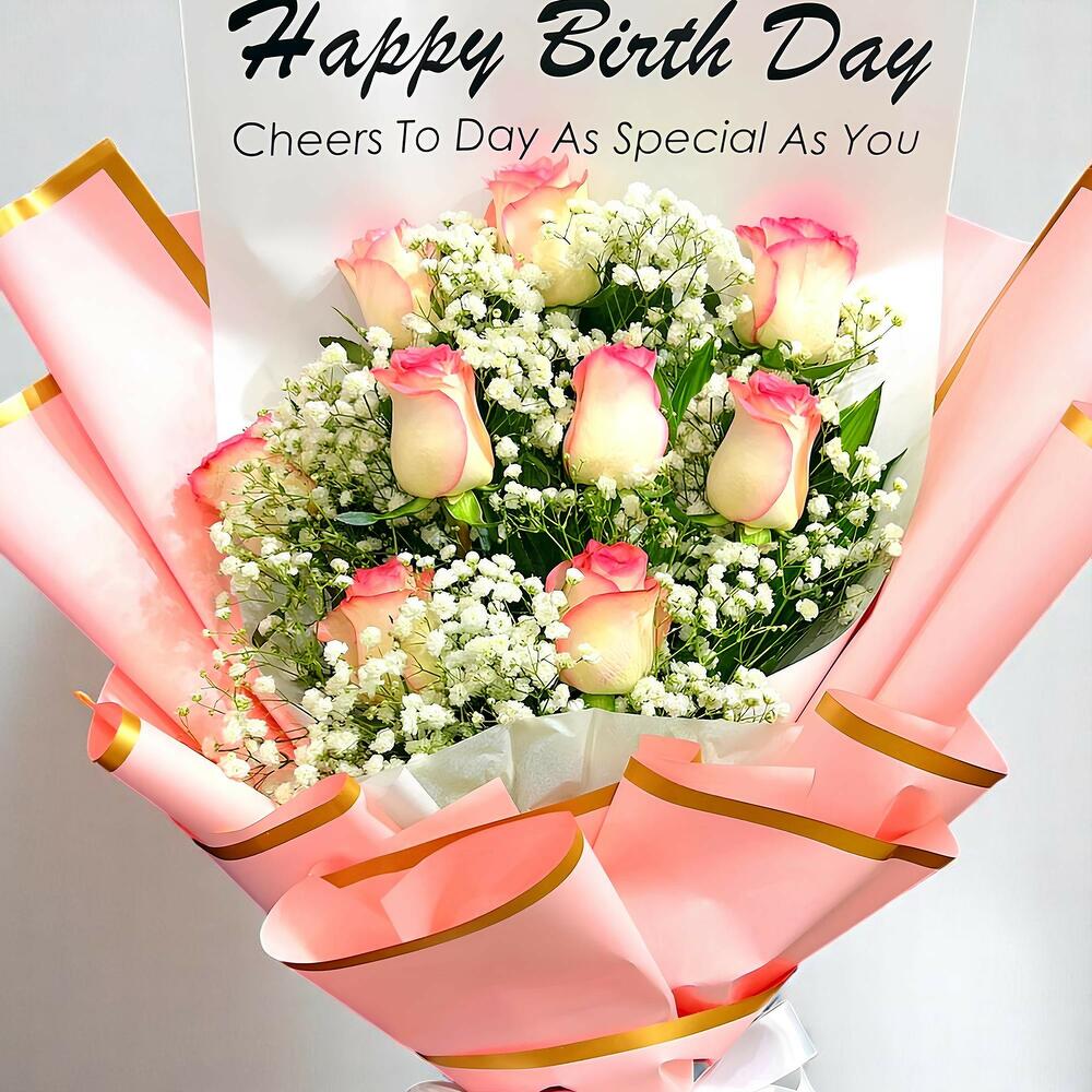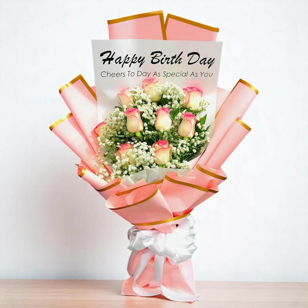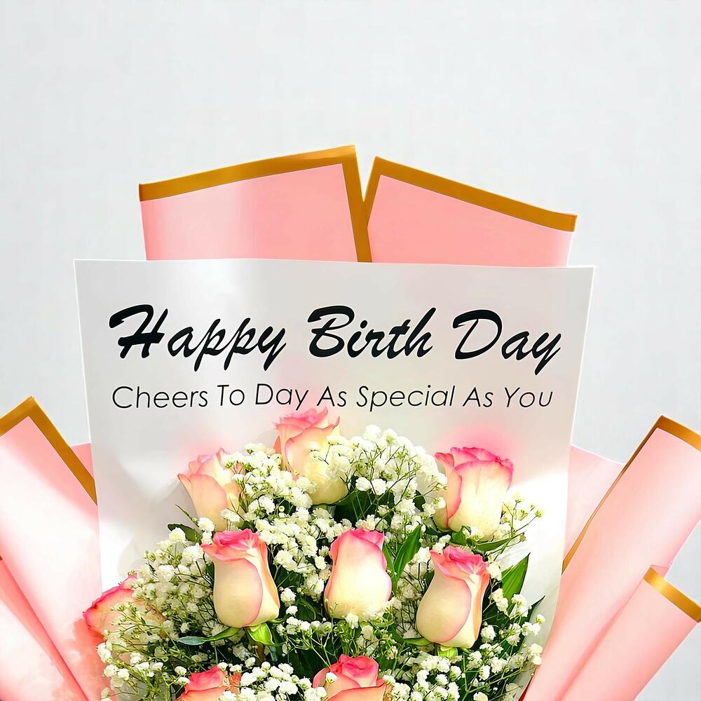 Roses roses avec gypsophile dans un emballage « Joyeux anniversaire »