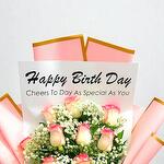 Ribbon - 1 pce Wrapping - 5 pce gypso - 3 pce pink roses - 9 pce