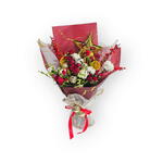 A beautiful bouquet of 2 ilex berries, 5 red roses, 5 white carnations, 5 white orchids, 4 stem baroness, 3 cotton puff Christmas balls, 2 dry oranges, 1 Merry Christmas, and Nobilis wrapped in red and white marble wrapping and tied with Christmas balls