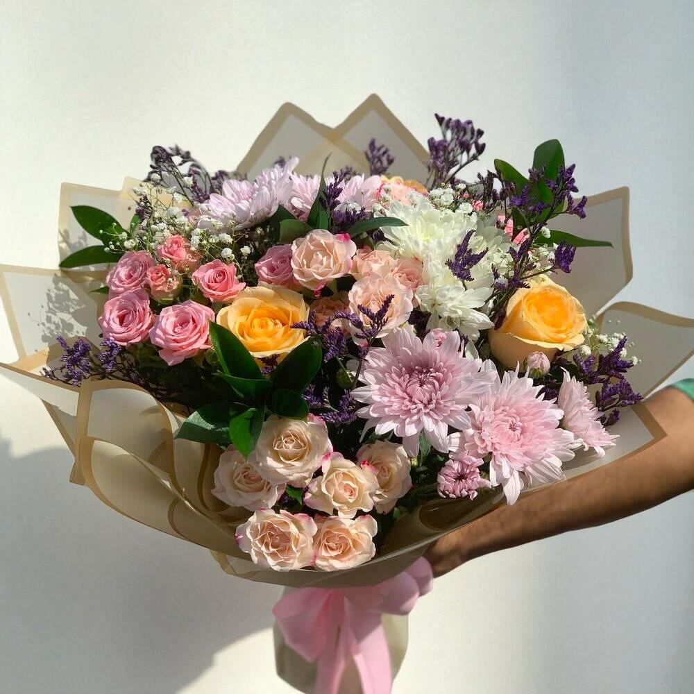 Chrysanthèmes 5 Roses 5 Roses spray 5 Caspia 3 dans un bouquet 250 AED.
