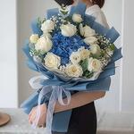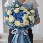 Gypsophila - 5 pce hortensia bleu - 3 pce eucalyptus - 10 pce roses blanches - 20 pce