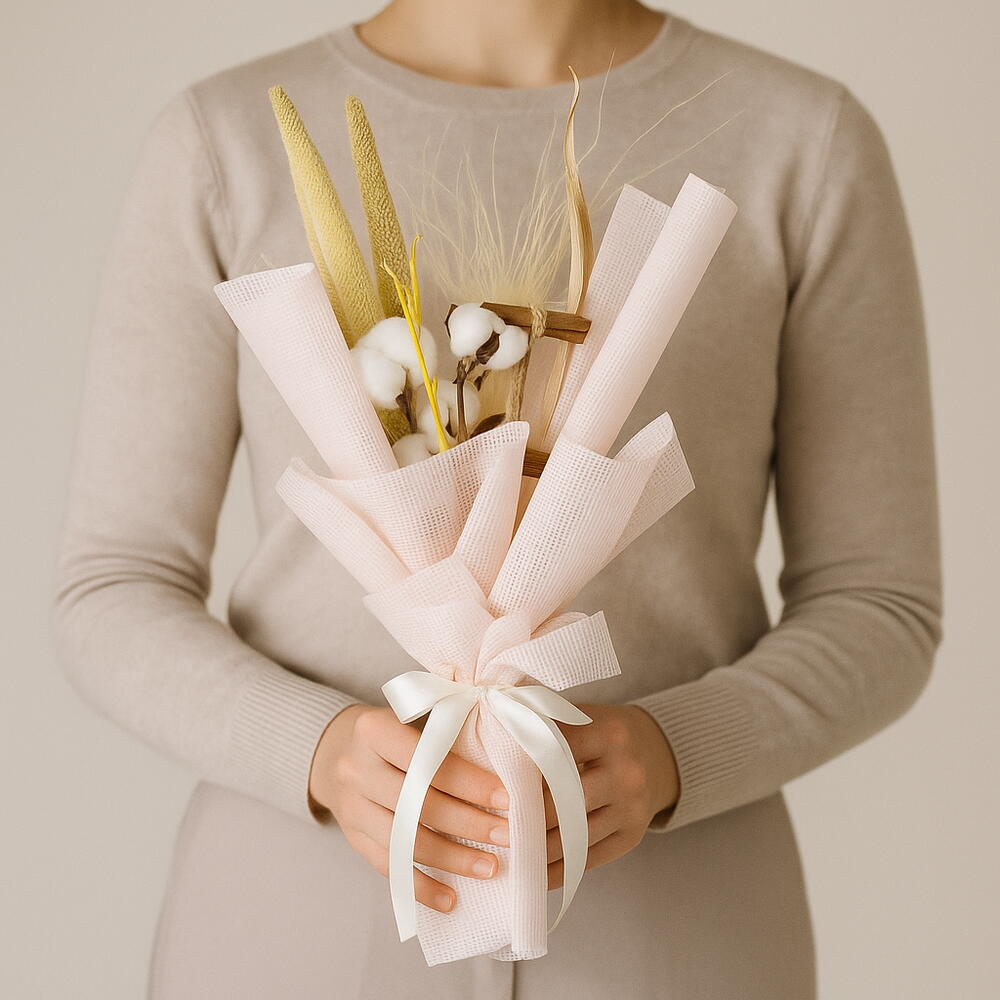 Coton - 3 pce bâton de cannelle - 2 pce herbe de la pampa beige - 1 pce feuille de maïs séchée - 2 pce tiges d'accent séchées jaunes - 1 pce