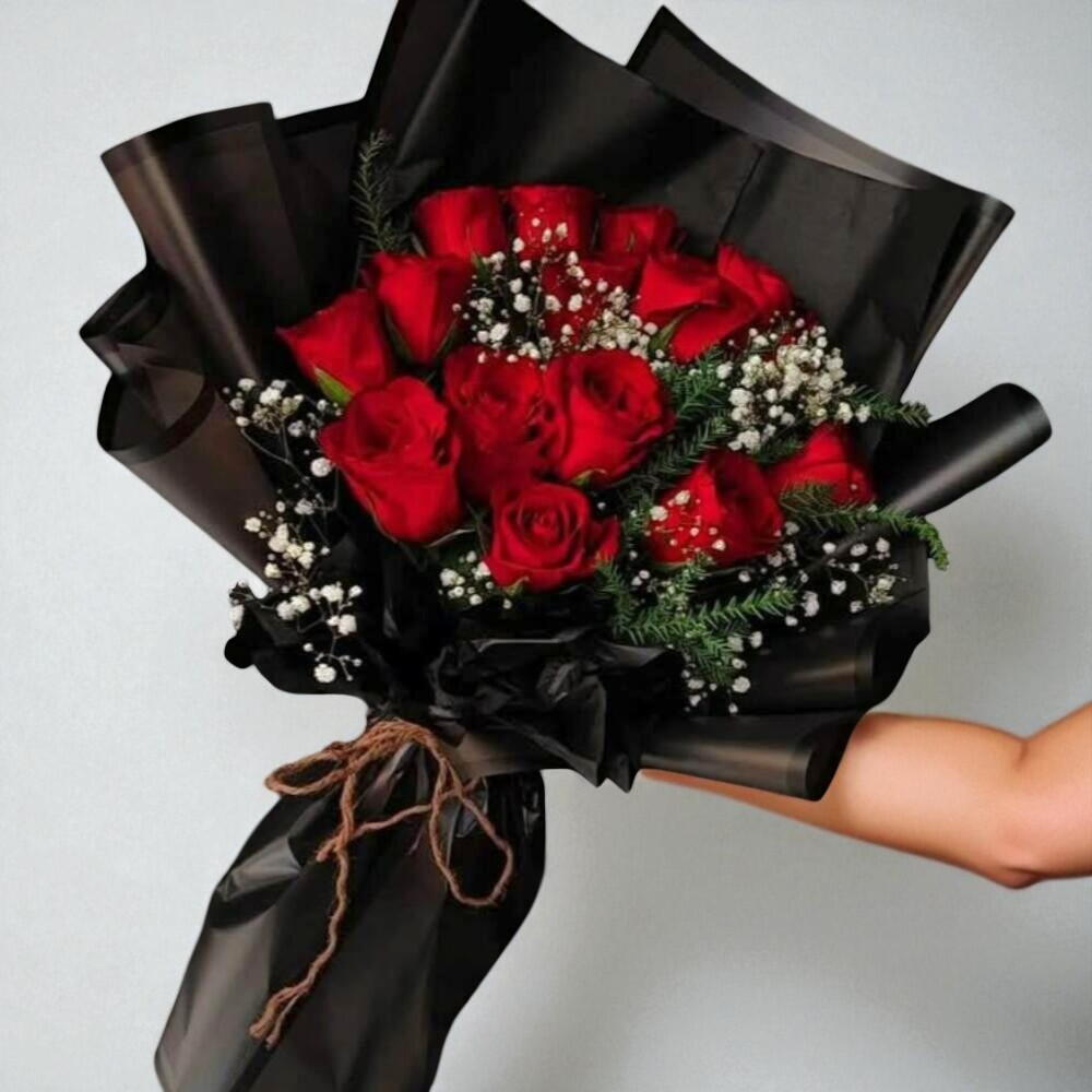 Un bouquet à couper le souffle de roses d'un rouge profond, délicatement encadré de gypsophiles. Enveloppé d'un blanc élégant, c'est le symbole parfait d'un amour intemporel et de la passion—idéal pour les anniversaires, les demandes en mariage ou les surprises romantiques.
