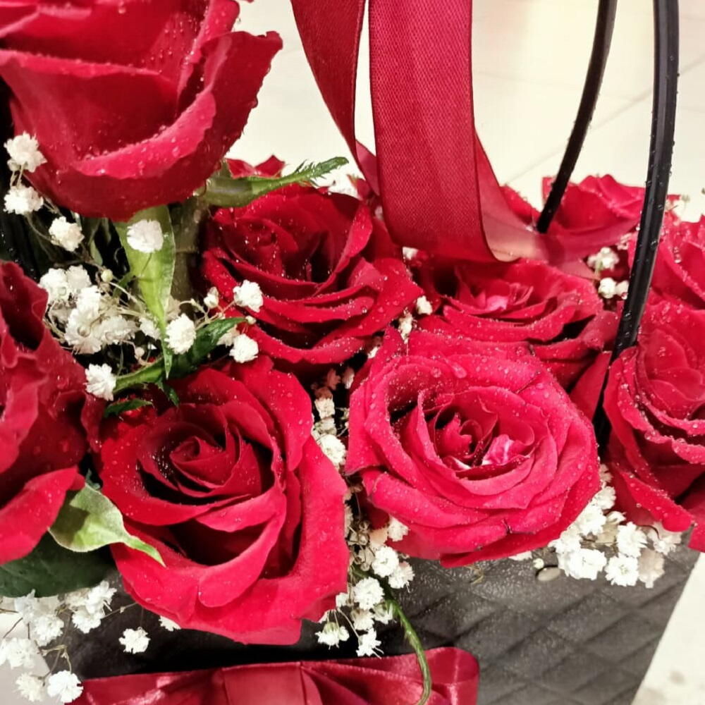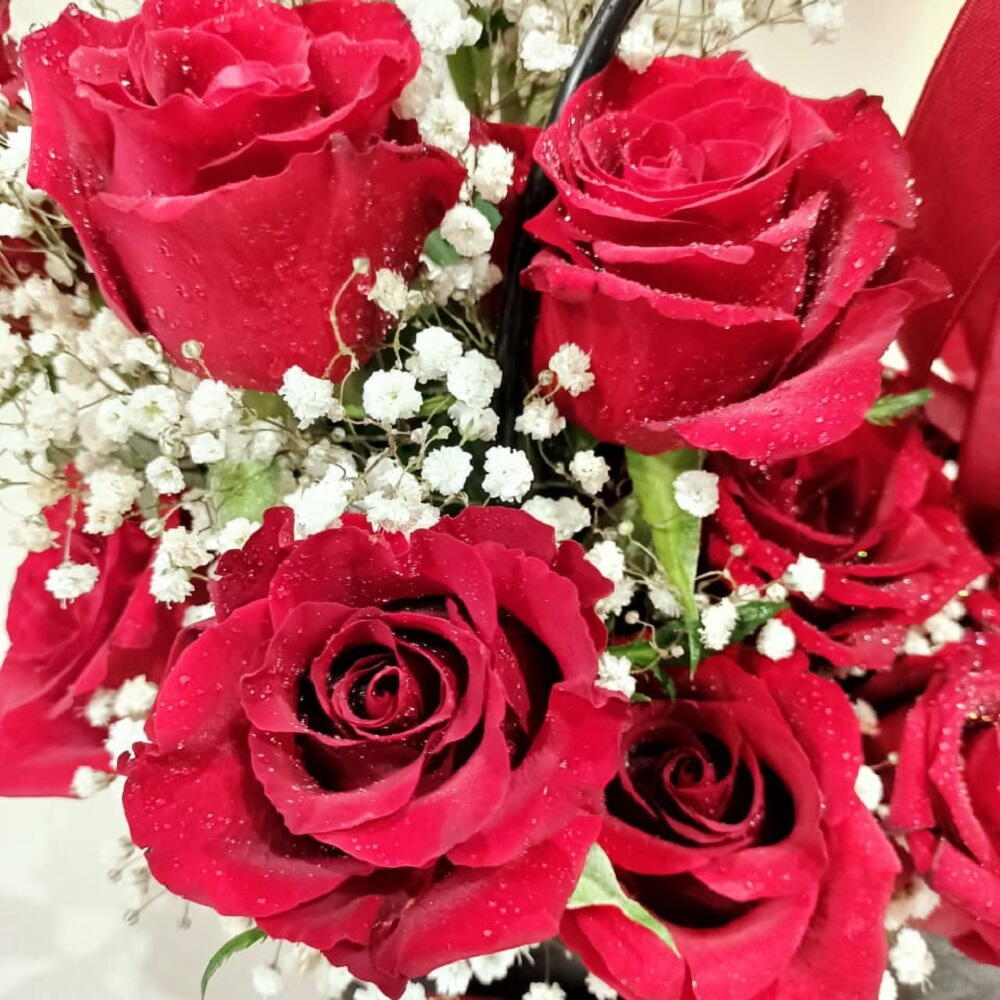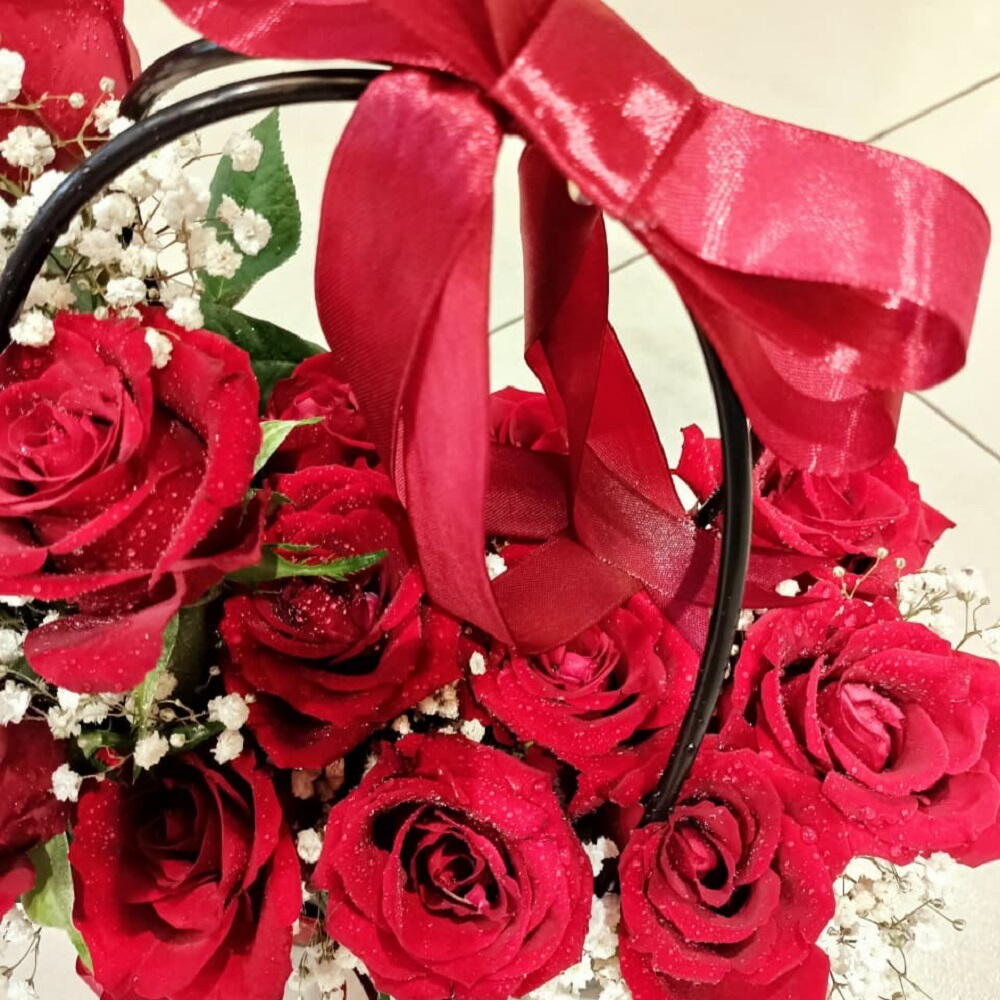 Un arrangement intemporel de roses d'un rouge profond rehaussé de délicates gypsophiles blanches, magnifiquement présenté dans un panier chic avec un nœud rouge — parfait pour exprimer l'amour, la romance et des émotions sincères.