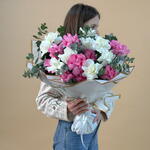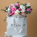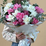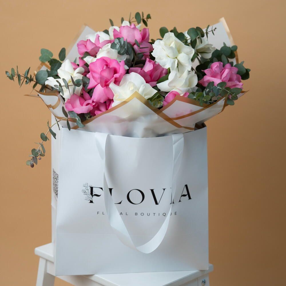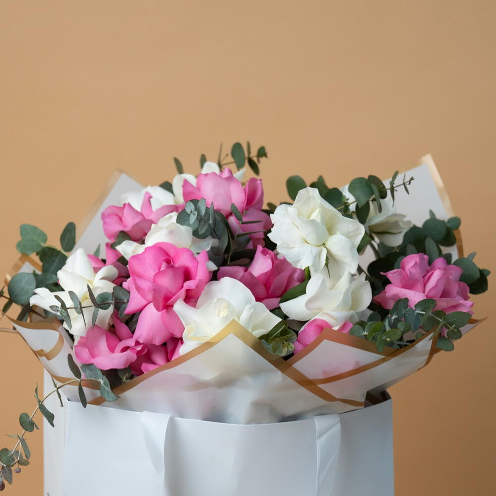Eucalyptus - 5 pce Pink rose - 10 pce White rose - 10 pce ribbon satin - 1 pce wrapping paper - 6 pce