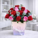 Composition florale : Type de fleurs : Roses fraîches (mélange de roses rouges et roses) Nombre total de roses : 21 tiges (11 rouges + 10 roses) Type de boîte : Boîte colorée haut de gamme Ruban : Nœud en satin crème Type de composition : Bouquet en boîte Description du produit Ce magnifique bouquet en boîte présente un superbe mélange de 11 roses rouges et 10 roses roses, soigneusement disposées dans une boîte colorée haut de gamme et ornées d'un délicat nœud en satin crème. Conçu pour exprimer l'amour, l'admiration et les sentiments les plus profonds, ce bouquet artisanal est idéal pour les anniversaires, les fêtes, les surprises romantiques et toutes les occasions spéciales. Avec sa présentation éclatante et ses finitions haut de gamme, ce bouquet offre un cadeau charmant et mémorable.