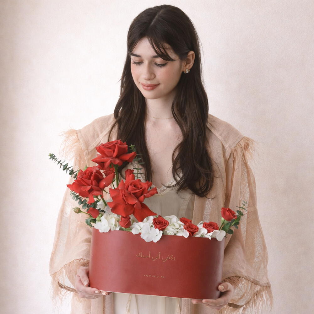 Combo d'amour avec chocolats est une expression raffinée de la Saint-Valentin qui marie des fleurs romantiques à une gourmandise gastronomique, comprenant 3 roses rouges, 1 hortensia blanc, 3 roses spray rouges et 5 eucalyptus disposés en une composition gracieuse et équilibrée. Présenté dans une grande boîte ovale «Dans mon cœur… toujours» écrite en arabe, cet élégant arrangement floral est accompagné d'un sachet de chocolats à la rose Bostani (18 pièces), créant un cadeau qui exprime l'amour à la fois par la beauté et la douceur. Soigneusement conçu, il est destiné à transformer des moments sincères en souvenirs inoubliables.