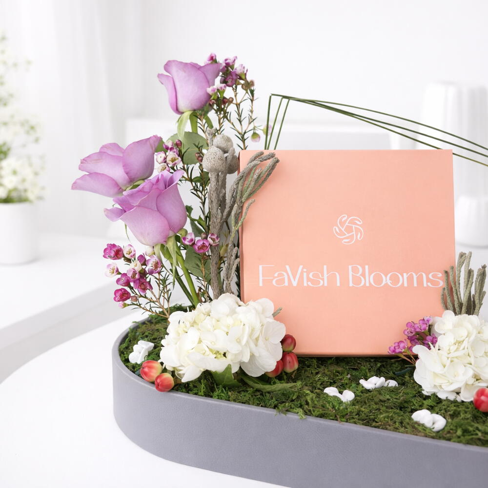 Expression de sophistication moderne et de charme intemporel, le coffret floral chocolat « Élégance Fraîche » est une création raffinée conçue pour impressionner. Cette élégante composition comprend : 1 hortensia blanc 5 roses violettes 2 tiges de fleurs de cire roses 2 tiges de baies d’hypericum rouges 3 brins d’herbe artificielle Pierres blanches décoratives 16 truffes au chocolat de qualité supérieure Présenté dans un luxueux coffret en cuir orné de mousse naturelle, ce coffret allie la richesse des textures florales à la gourmandise des chocolats artisanaux, créant un équilibre parfait entre romantisme et raffinement. Des tons lavande délicats se mêlent à la fraîcheur des fleurs blanches, sublimés par des brins d’herbe artificielle et des touches de baies éclatantes. Accompagné de 16 truffes artisanales, ce coffret est idéal pour les anniversaires, les fêtes, les cadeaux d’entreprise ou pour une surprise élégante à Dubaï.