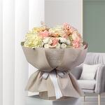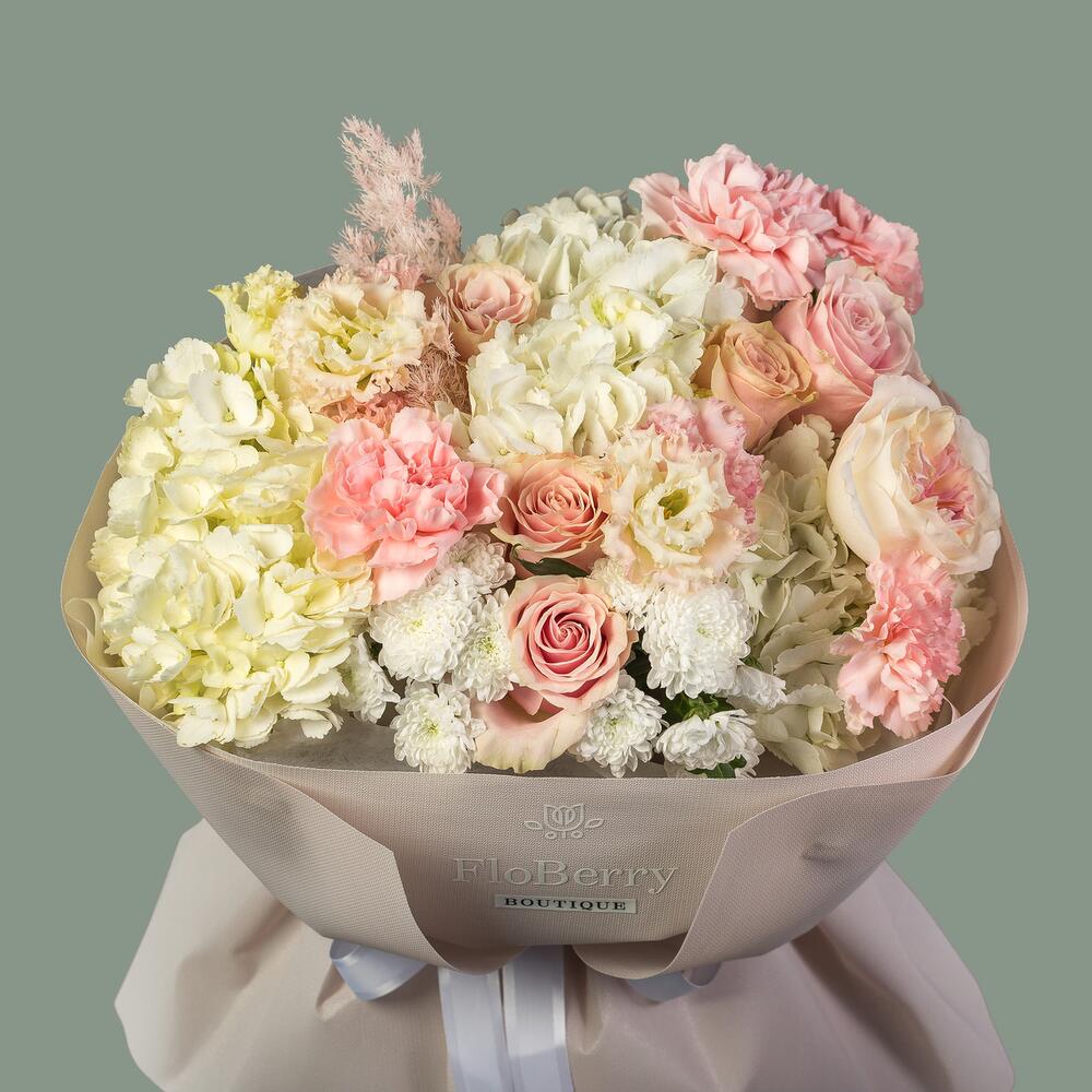 Eustoma - 2 pce Eucalyptus - 1 pce Hydrangea - 3 pce Wrapping - 1 pce carnation - 5 pce asperge - 1 pce rose david austin - 1 pce feuille de pistacia - 2 pce rose mondial 60 ecu - 5 pce