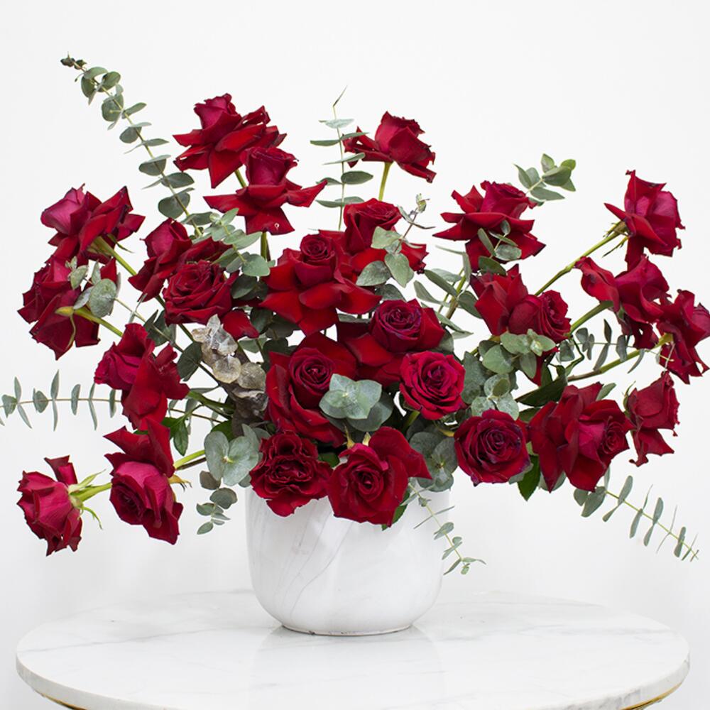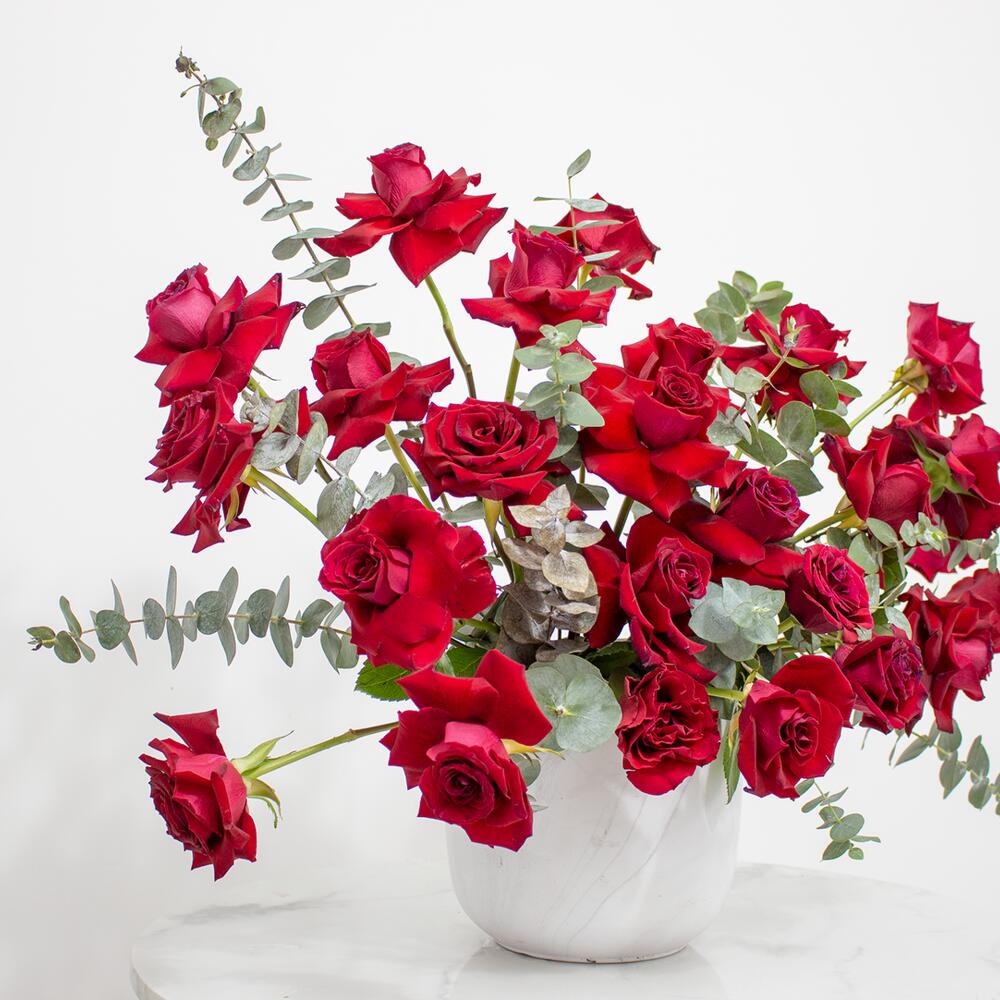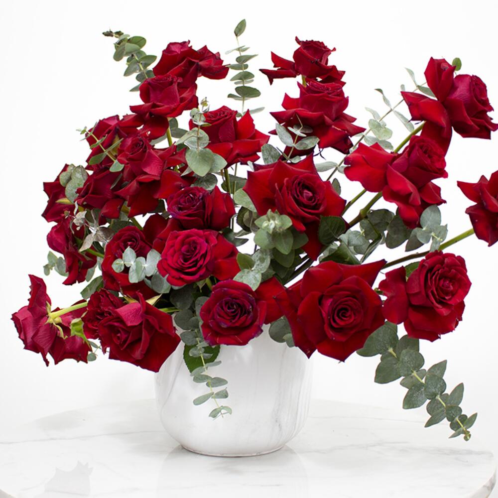 Red rose - 30 pce Eucalyptus - 5 pce Vase - 1 pce