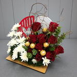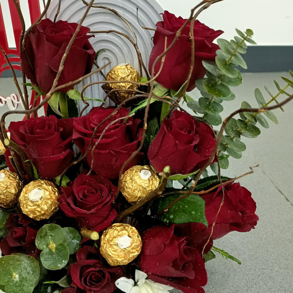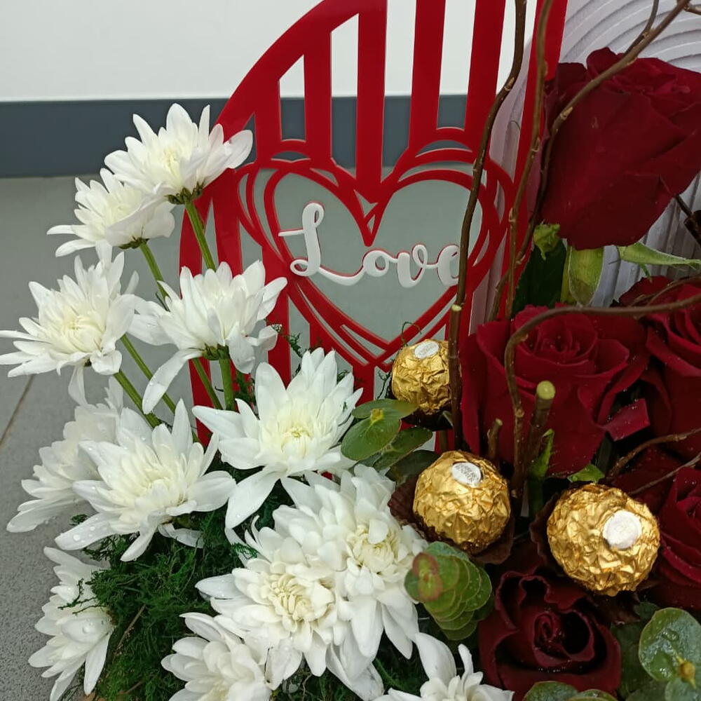 Cette composition florale moderne met en équilibre la profondeur romantique des roses rouges veloutées et l'éclat vif des chrysanthèmes blancs. Parsemée de truffes Ferrero Rocher emballées dans un papier doré et de branches de saule sculpturales, elle présente un fond décoratif « Love », ce qui en fait une fusion sophistiquée d'indulgence sucrée et de beauté botanique classique.
