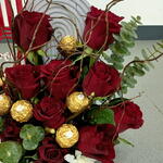 Eucalyptus - 2 pce Chrysanthemum - 5 pce Ferrero rocher - 6 pce red roses - 10 pce support en acrylique - 1 pce sylex - 3 pce