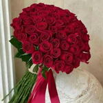 Le bouquet est une composition ronde et luxuriante de roses rouge profond serrées les unes contre les autres, formant une sphère dramatique et douce comme du velours. Les tiges sont enveloppées d'un ruban rouge épais et brillant qui se déploie en cascade comme un courant de feu, ajoutant une touche luxueuse et élégante. De fraîches feuilles vertes apparaissent entre les roses, offrant au bouquet un contraste naturel et vibrant avec les riches pétales rouges. L'ensemble repose sur une surface blanche texturée, mettant en valeur l'esthétique classique et romantique du bouquet et faisant ressortir les roses rouges avec une beauté intense et sensuelle.