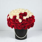 Symphonie d'élégance intemporelle et de contrastes, cet arrangement de roses luxueux présente un dégradé audacieux de fleurs rouge profond et ivoire délicat, créant une stupéfiante illusion en forme de cœur en son centre. Présenté dans une boîte à chapeau de créateur noir mat et orné d'un fin cordon de perles, c'est un choix captivant pour les anniversaires, les déclarations romantiques ou une décoration qui attire l'attention. Conservez l'arrangement frais en hydratant quotidiennement la mousse florale avec de l'eau propre. Exposez-le dans un endroit frais, à l'abri de la lumière directe du soleil et de la chaleur. Avec des soins appropriés, cette composition florale artistique continuera d'enchanter par sa sophistication et sa grâce.