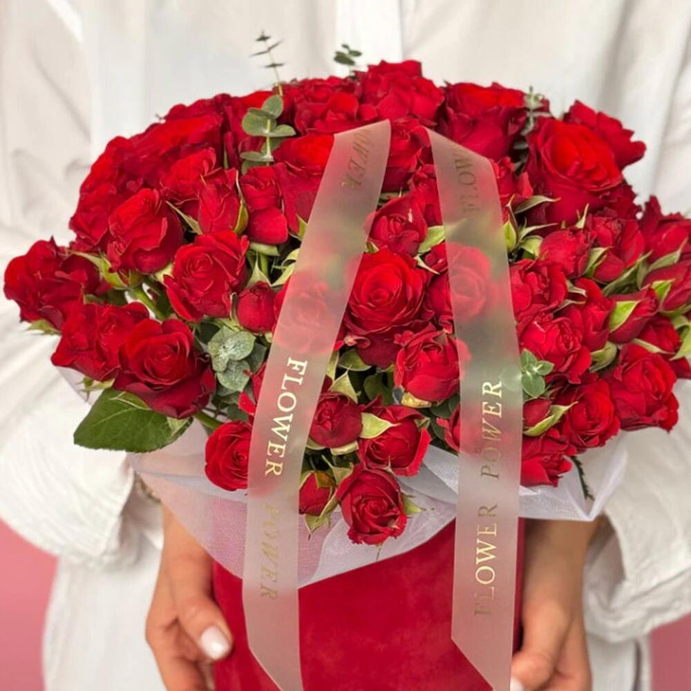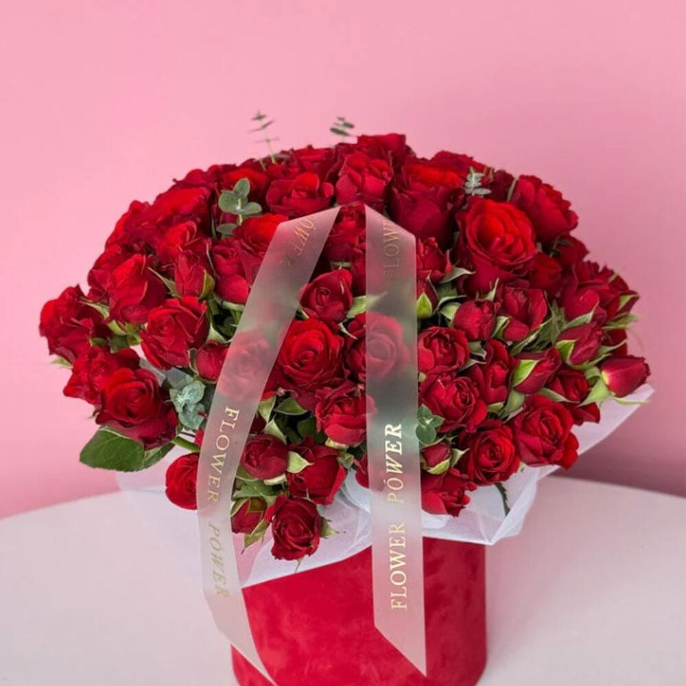 Un arrangement audacieux et luxueux de roses spray rouges vives, magnifiquement présenté dans une boîte à chapeaux assortie et saisissante. Ce design Scarlet Passion, rehaussé d'eucalyptus frais, symbolise l'amour profond, la passion et l'admiration — le cadeau romantique parfait pour les anniversaires ou pour un geste grandiose et inoubliable. Petite taille - 20 roses spray, 7 roses