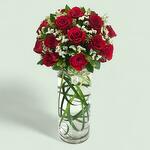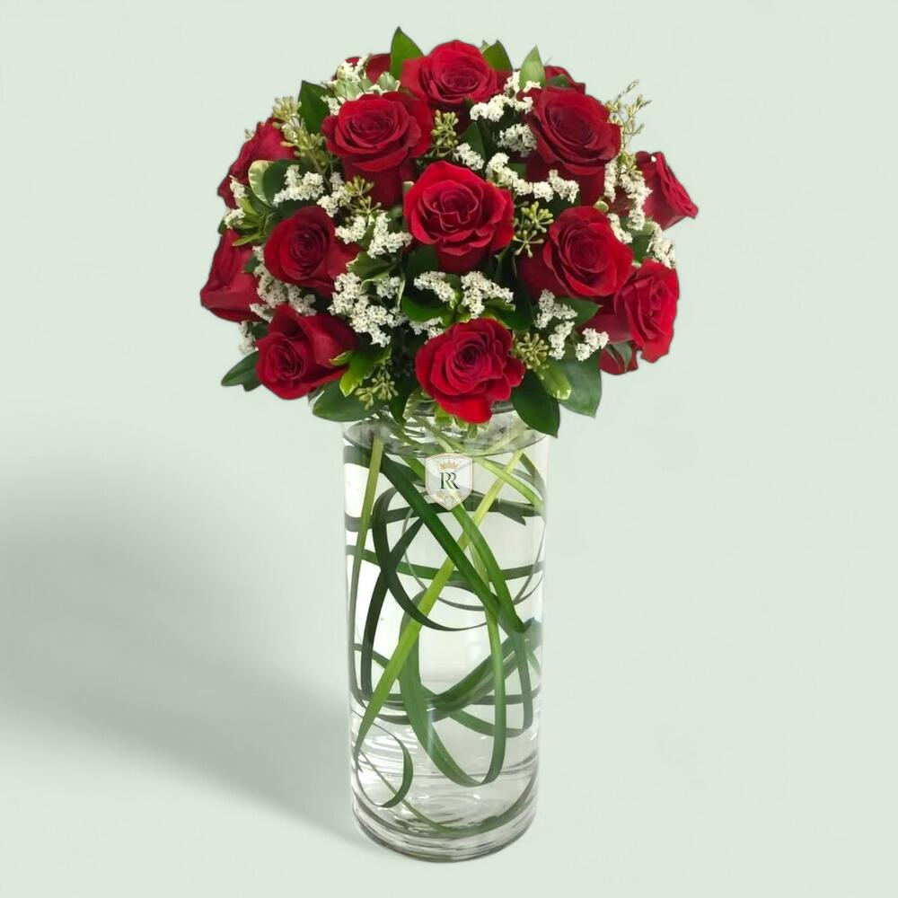 Un arrangement saisissant de roses rouges intenses, agrémenté de délicates gypsophiles blanches et d'un feuillage vert luxuriant, élégamment présenté dans un vase haut en verre transparent avec des feuilles vertes décoratives immergées dans l'eau.