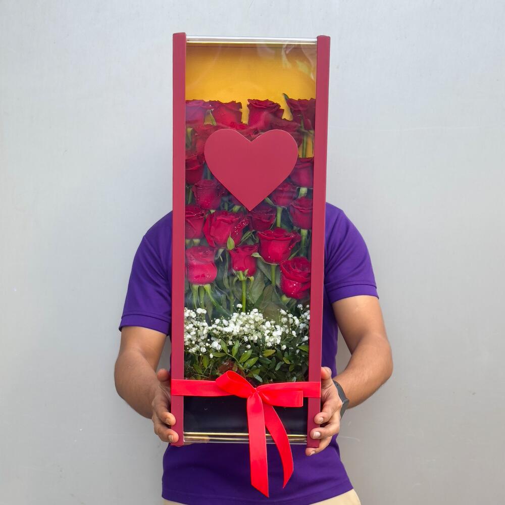 Rêverie Cramoisie Roses | Boîte transparente élégante avec 21 roses rouges | Livraison aux Émirats arabes unis