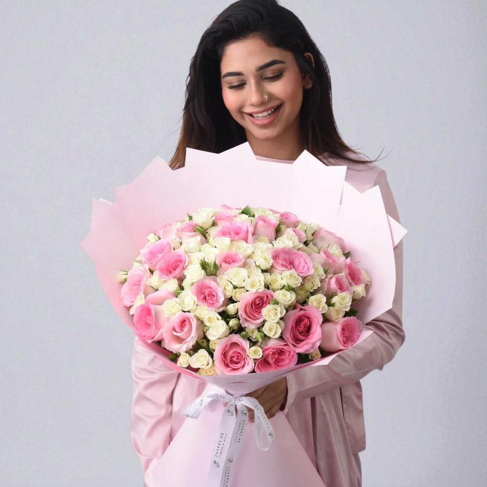 Faites une déclaration majestueuse d'amour et d'admiration avec la Couronne de Pétales – Bouquet signature Zuvees 50 roses. Débordant de fleurs luxueuses aux tons romantiques de rose et de blanc, ce magnifique bouquet incarne une grandeur sincère et une grâce féminine. Création signature Zuvees, cet arrangement royal est la pièce maîtresse parfaite pour les moments les plus mémorables de la vie.
