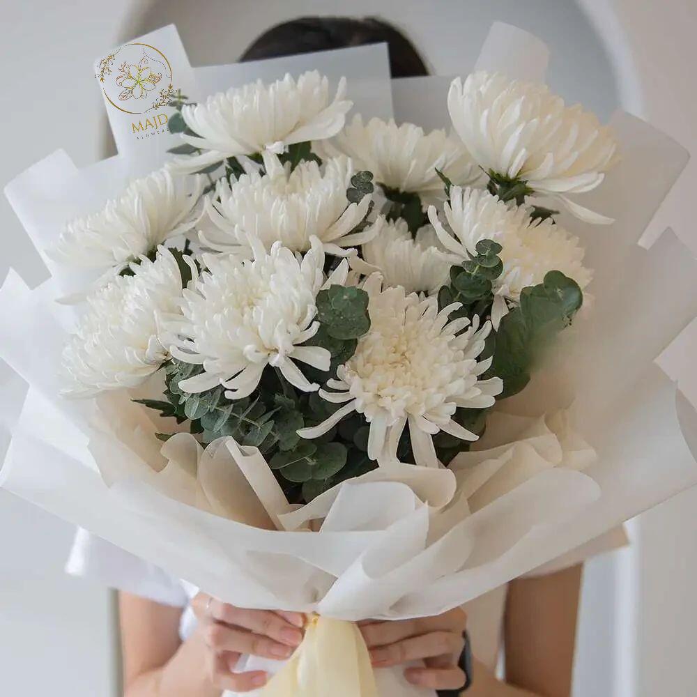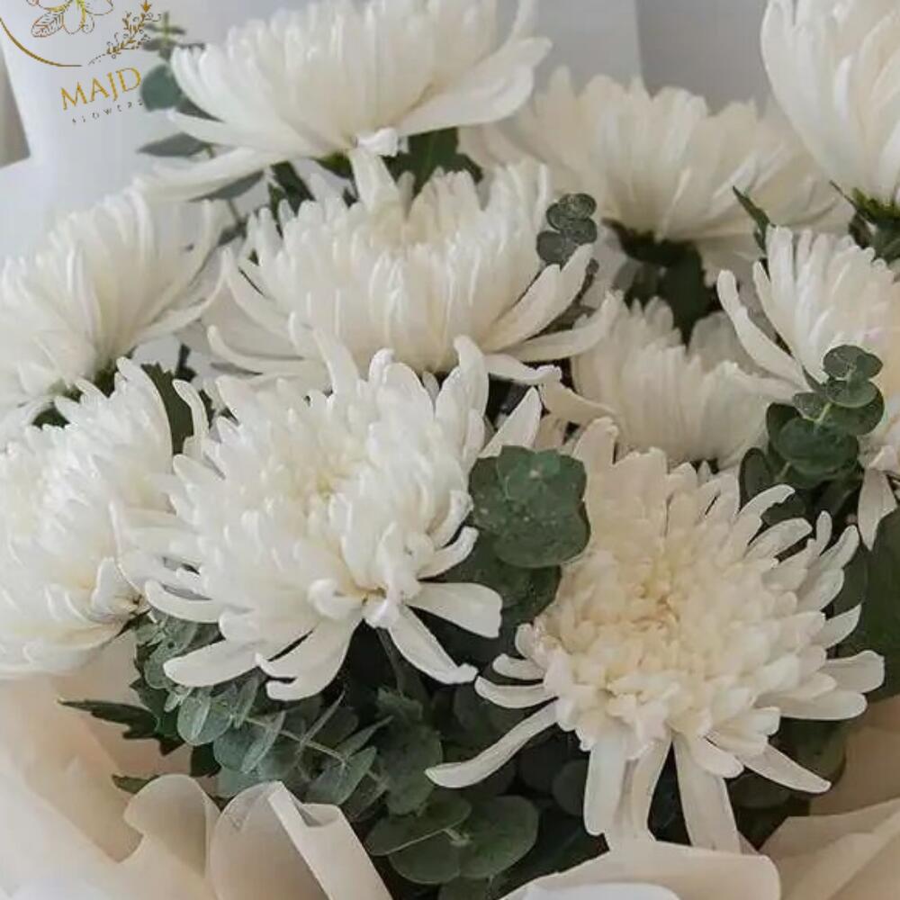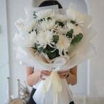 Chrysanthèmes blancs délicats enveloppés d'amour et de simplicité — un symbole parfait de pureté, de paix et de grâce. Idéal pour les occasions sincères, les gestes attentionnés ou simplement pour illuminer la journée de quelqu'un avec sérénité et beauté.*