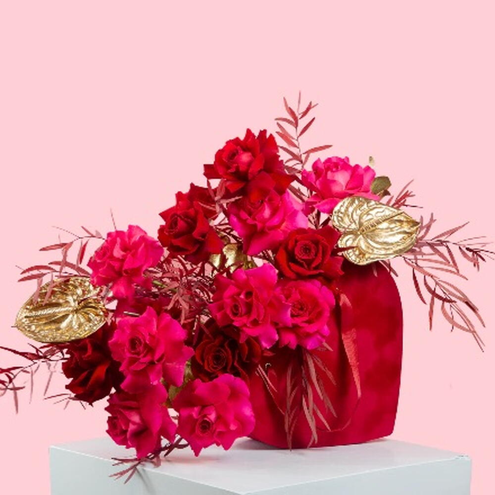 Red rose - 6 pce Eucalyptus - 1 pce anthurium doré - 3 pce rose fuchsia - 8 pce