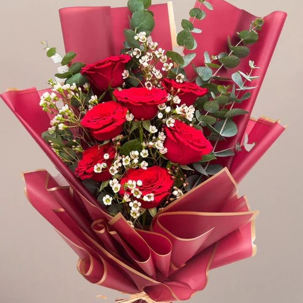 Une touche élégante et romantique à notre bouquet classique de roses rouges. De petites fleurs de cire, accompagnées de roses rouges et de feuilles d'eucalyptus, enveloppées dans un papier cadeau romantique et attachées avec de la raphia.