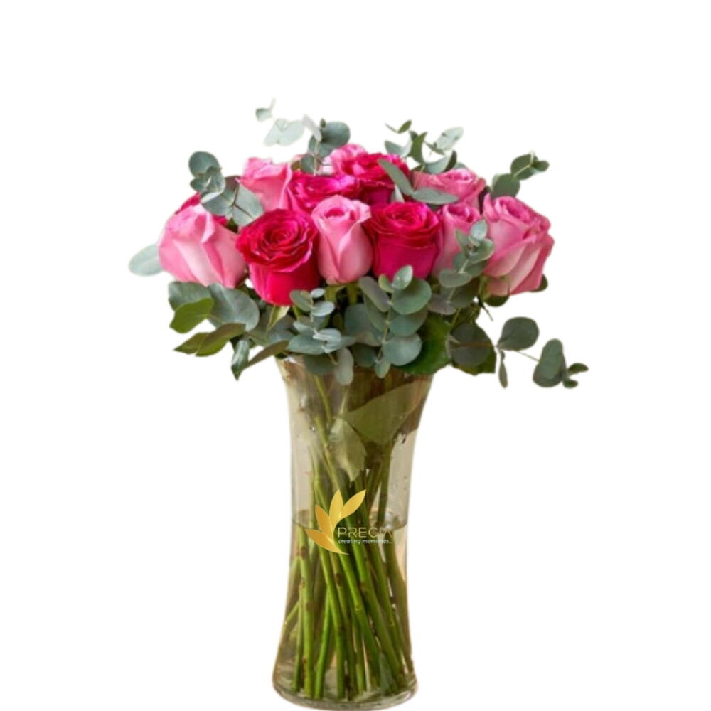 10 roses nacrées, 10 roses rose foncé, 1 bouquet d'eucalyptus