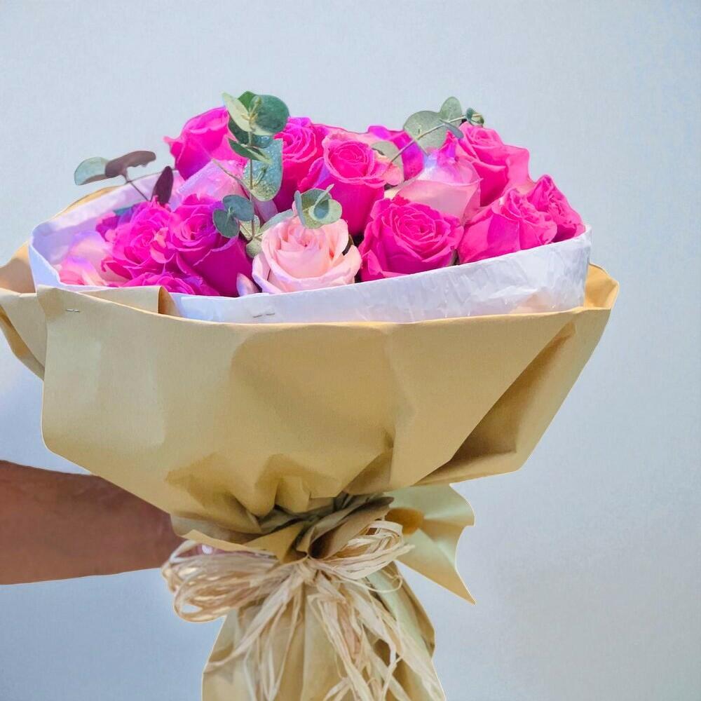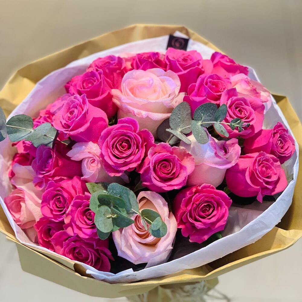 24 ROSES ROSE FONCÉ 6 ROSES ROSE ET EUCALYPTUS 2 DANS UN BOUQUET 350 AED,.