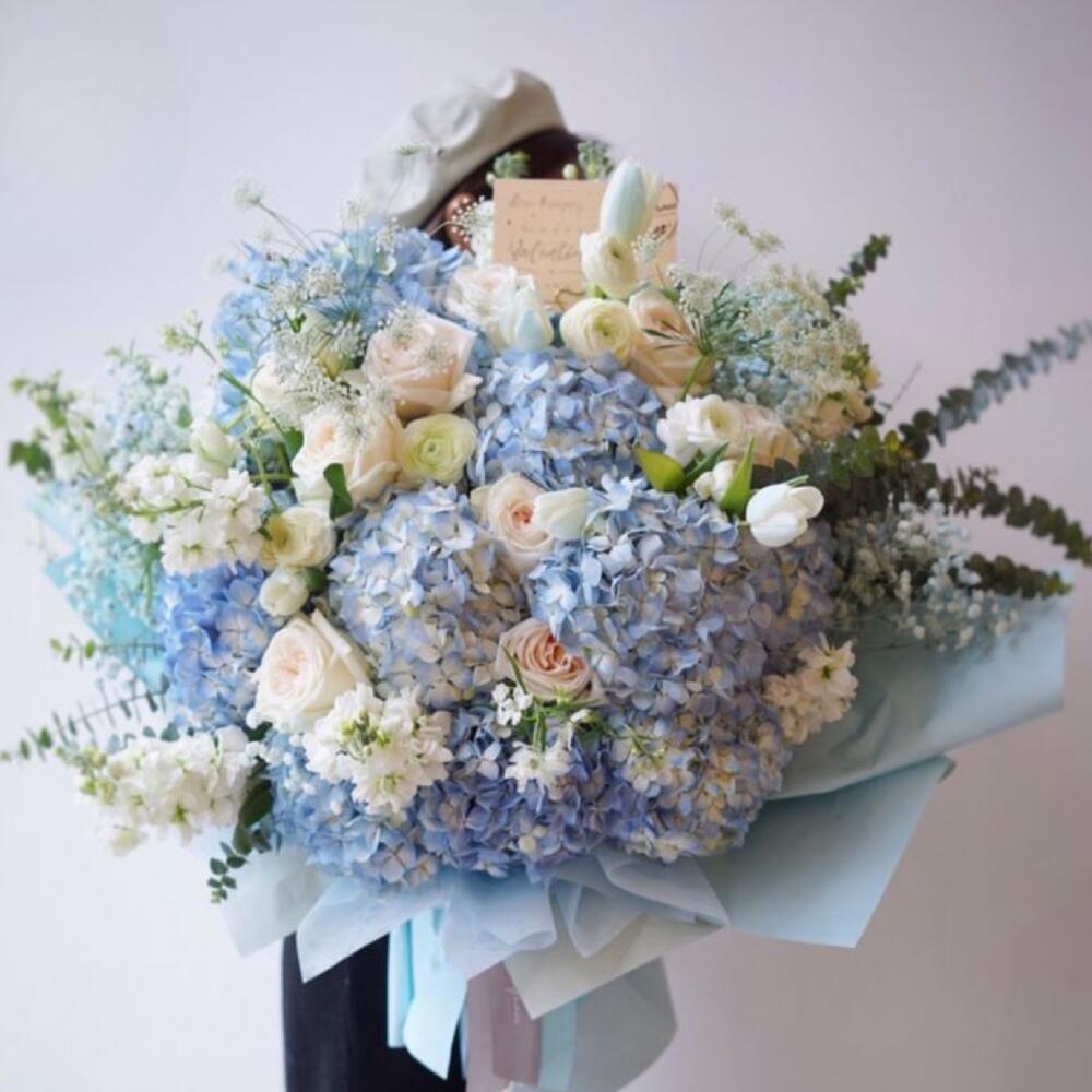white spray rose - 10 pce nigelle - 10 pce hortensia bleu - 10 pce tulipes blanches - 10 pce eucalyptus leaves - 10 pce blanc pâle rose - 10 pce
